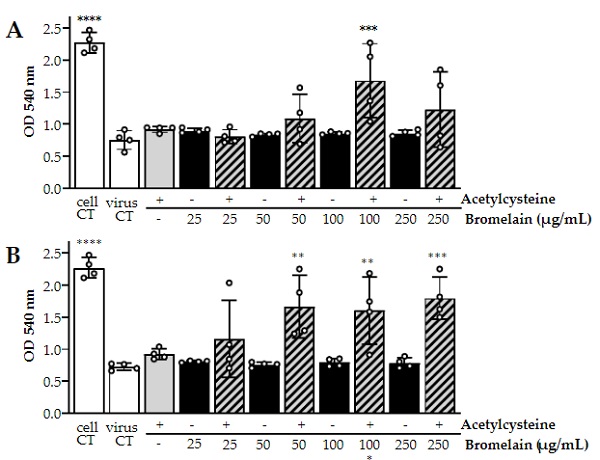 Figure 2.Cell lysis assays demonstratedin vitroinactivation potential of Acetylcysteine and Brome-lain combined (BromAc) against SARS-CoV-2. Cell viability was measured by cell staining withNeutral Red, where optical density (OD) is directly proportional to viable cells. Low OD wouldsignify important cell lysis due to virus replication.